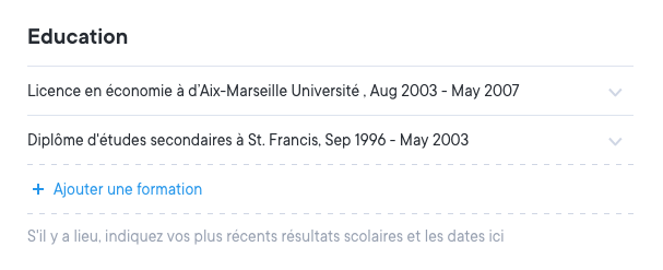 En règle générale, incluez toujours votre plus haut niveau d'éducation. En d'autres termes, si vous avez une maîtrise, il n'est pas nécessaire d'ajouter votre diplôme d'études secondaires ni même les votre diplôme d'associé. N'oubliez pas que l’espace est limité. Si vous avez beaucoup d’expérience professionnelle, il n'est pas pertinent d'inclure des détails supplémentaires sur les études. Toutefois, s'il s'agit d'un CV pour votre premier emploi après l'école, il est approprié d'approfondir votre expérience scolaire dans cette section.