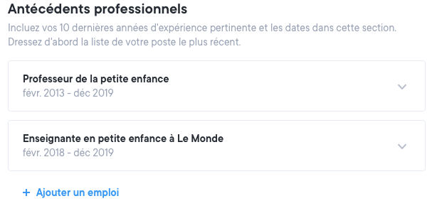C'est la partie principale de votre CV. Ajoutez des données sur les 10 dernières années d'expérience pertinente. Voici un article utile sur les cas où vous devriez (et ne devriez pas) inclure tous les emplois passés dans votre CV.