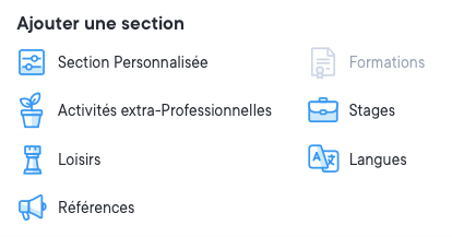 En bas de l'éditeur se trouvent quelques sections en option à inclure comme les formations, les références, les langues, les activités extra-professionnelles, et les stages.