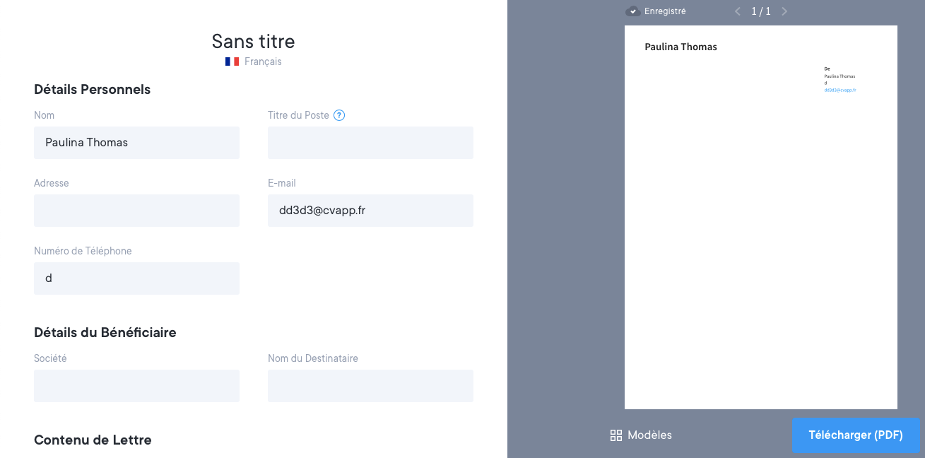 Vous pouvez utiliser CVapp.fr pour rédiger rapidement et facilement une lettre de motivation grâce à nos outils d'aide à la rédaction. Vous pouvez également partager facilement la lettre avec n'importe qui en utilisant un lien en ligne. Chaque modèle de CV est accompagné d'un modèle de lettre de motivation correspondant que vous pouvez utiliser pour l'envoyer avec votre CV. Vous avez accès à un nombre illimité de modèles de lettres de motivation, à des choix de couleurs personnalisés et à la possibilité de télécharger des PDF. Vous pouvez même fusionner votre CV et votre lettre de motivation en un seul document, ce qui rend l'expérience de recrutement plus pratique pour tout le monde.