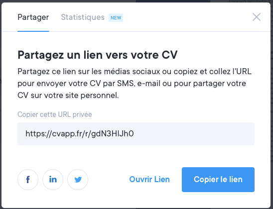 Chaque version de votre CV a sa propre URL unique qui peut être partagée. Si vous avez plusieurs versions de votre CV, vous aurez différentes URL que vous pourrez également partager.