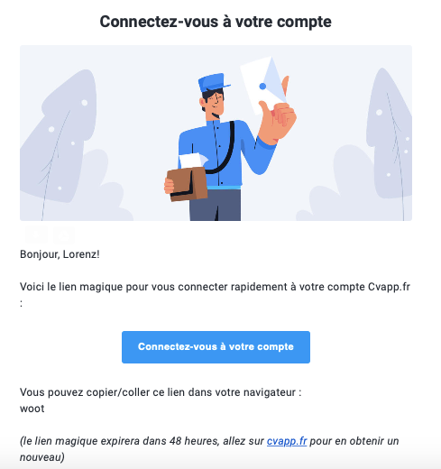 Si votre adresse e-mail fonctionne, mais que vous ne recevez pas le lien magique, consultez votre dossier spam ou essayez de rechercher le terme CVapp.fr dans votre boîte mail.